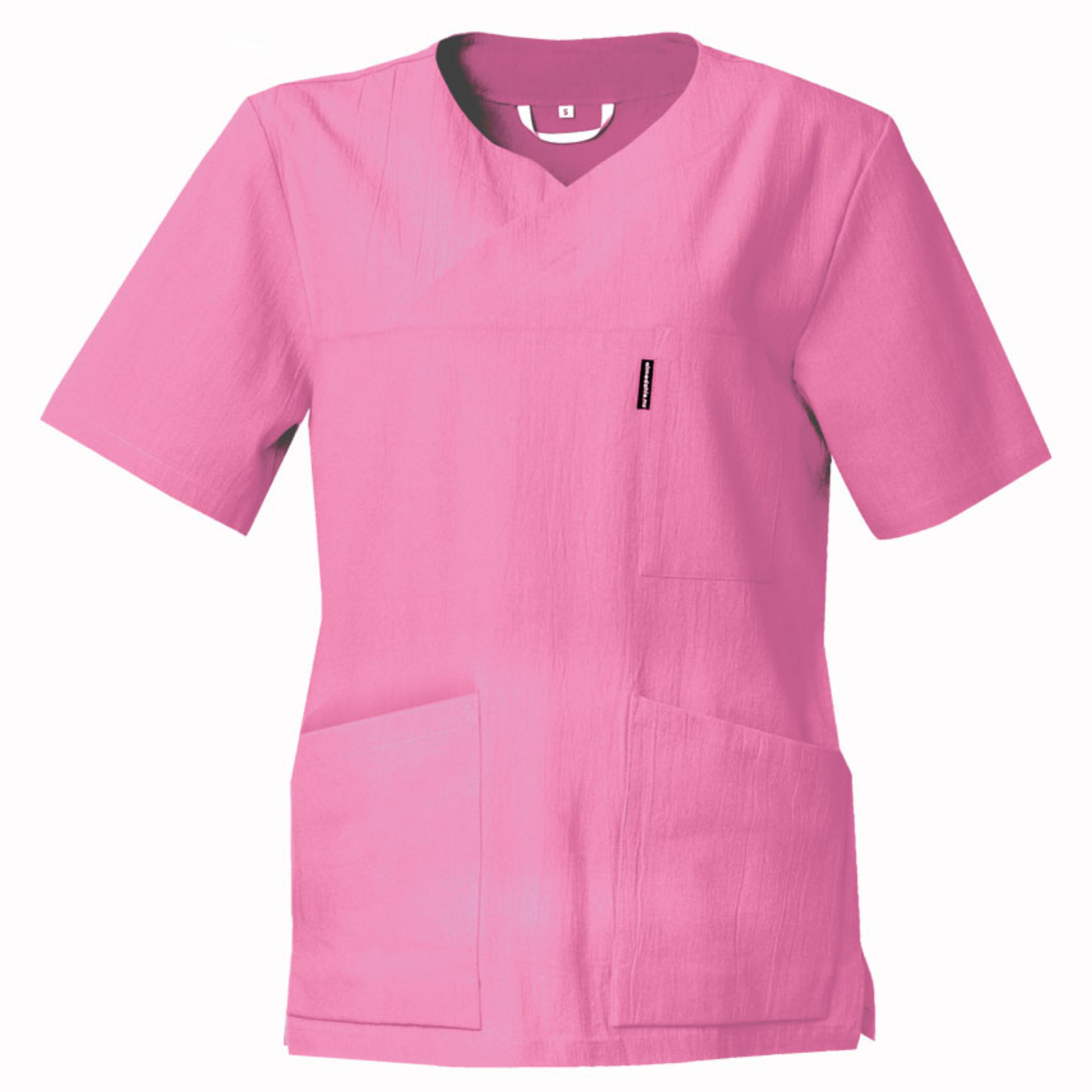 V-blus i rak unisexmodell med kort ärm och ringad v-hals med dold knapp. Sprund i sidor. En bröstficka och två utanpåfickor varav en med extra telefonficka och den andra med nyckelhälla. Hank i nacke.