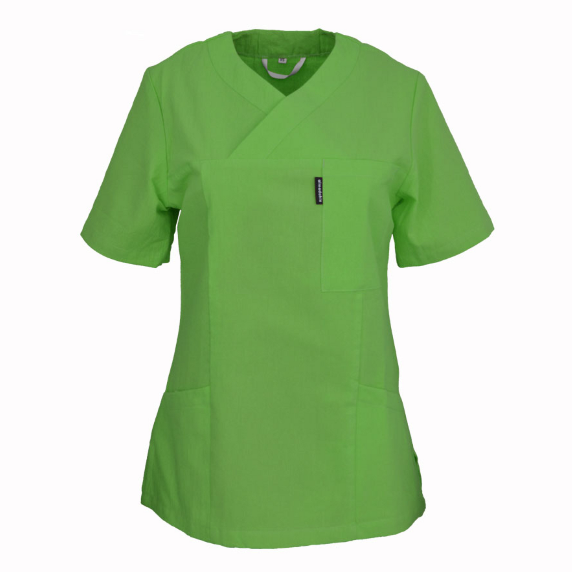 V-halsad bussarong i lätt insvängd modell med kort ärm. Sprund i sidor. En bröstficka och två utanpåfickor varav en med extra telefonficka och den andra med nyckelhälla. Sprängveck bak i ryggen, vilket gör att den lämpar sig bra för personer med större byst. Hank i nacke.
