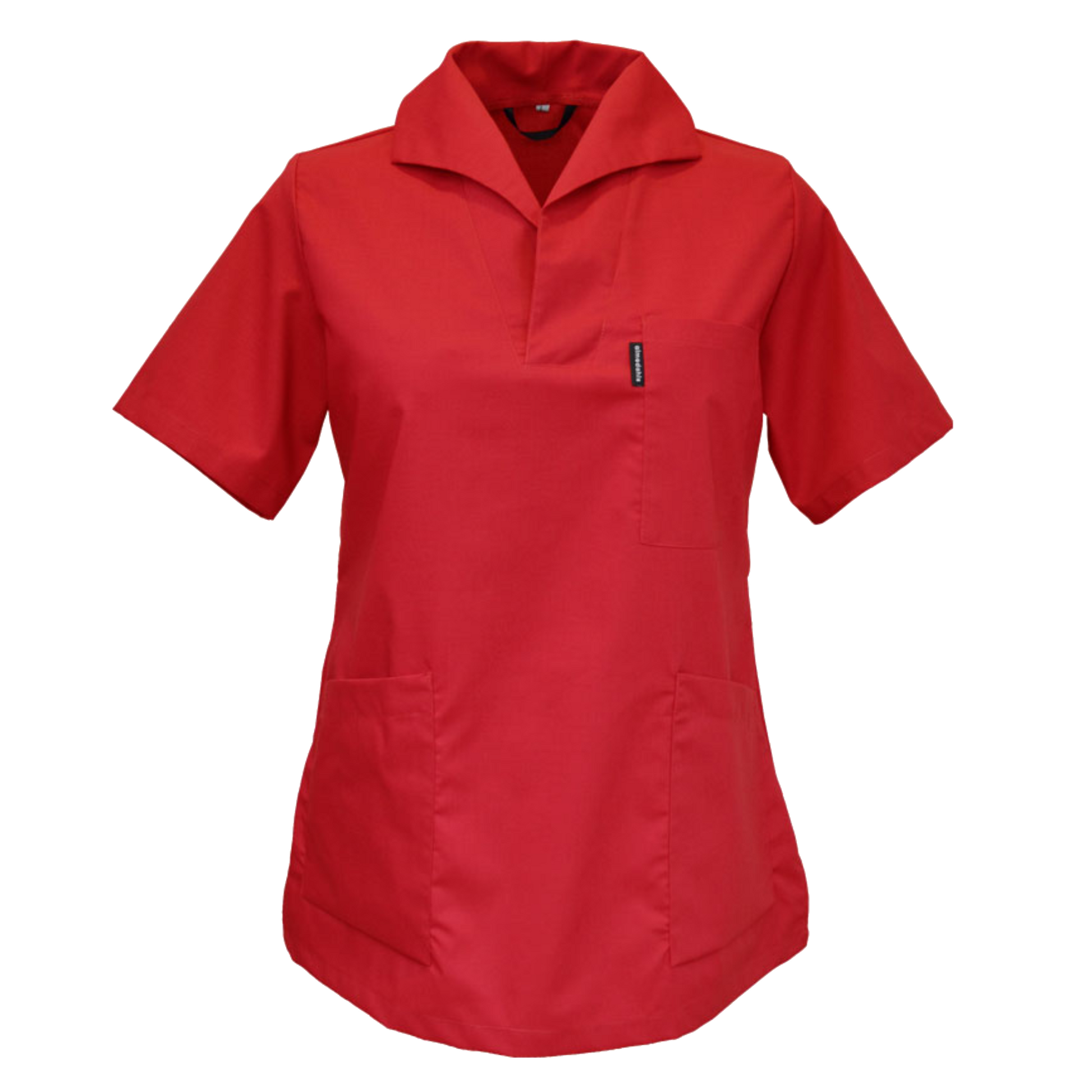 Vårdblus med v-formad hals och ståkrage. Kort ärm och hel knäppning fram med knappar. Lätt figursydd modell. Sprund i sidorna. En bröstficka och två utanpåfickor.