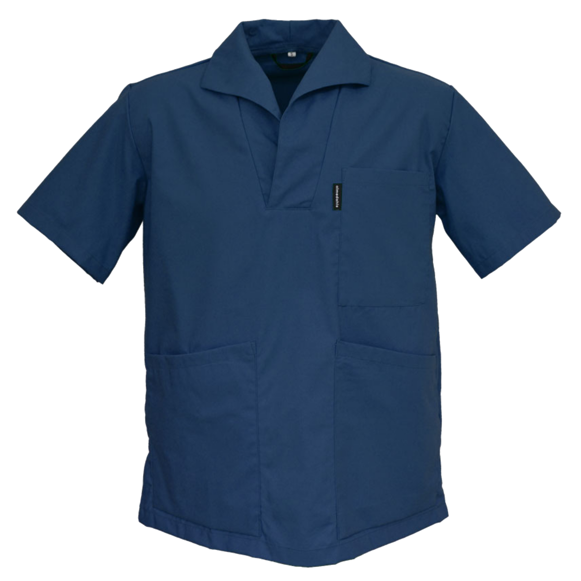Almedahls Bussarong i rak modell med krage och kort ärm. Sprund i sidor. En bröstficka och två sidfickor, varav den ena med extra telefonficka och den andra med nyckelhälla. Hank i nacke.
