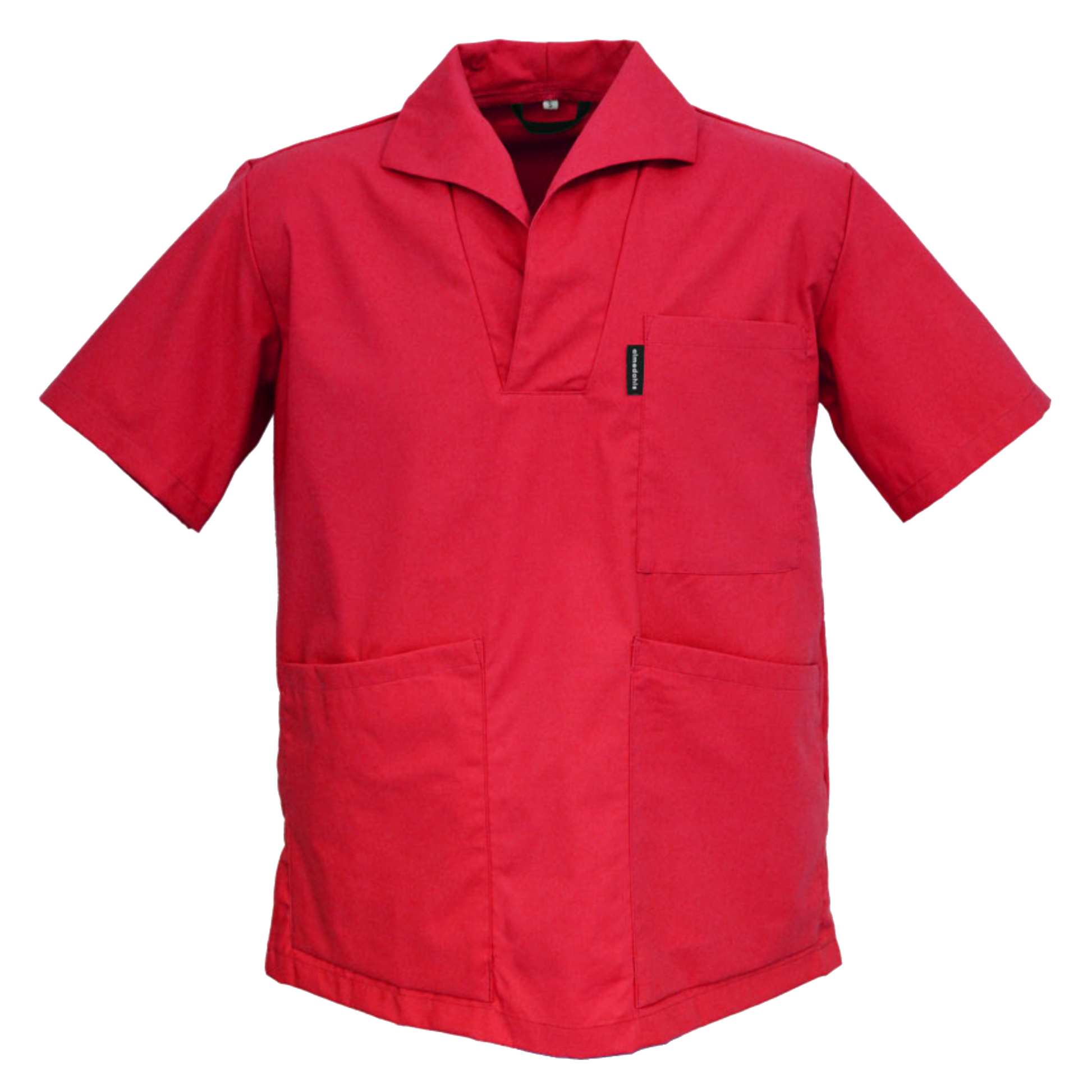 Almedahls Bussarong i rak modell med krage och kort ärm. Sprund i sidor. En bröstficka och två sidfickor, varav den ena med extra telefonficka och den andra med nyckelhälla. Hank i nacke.