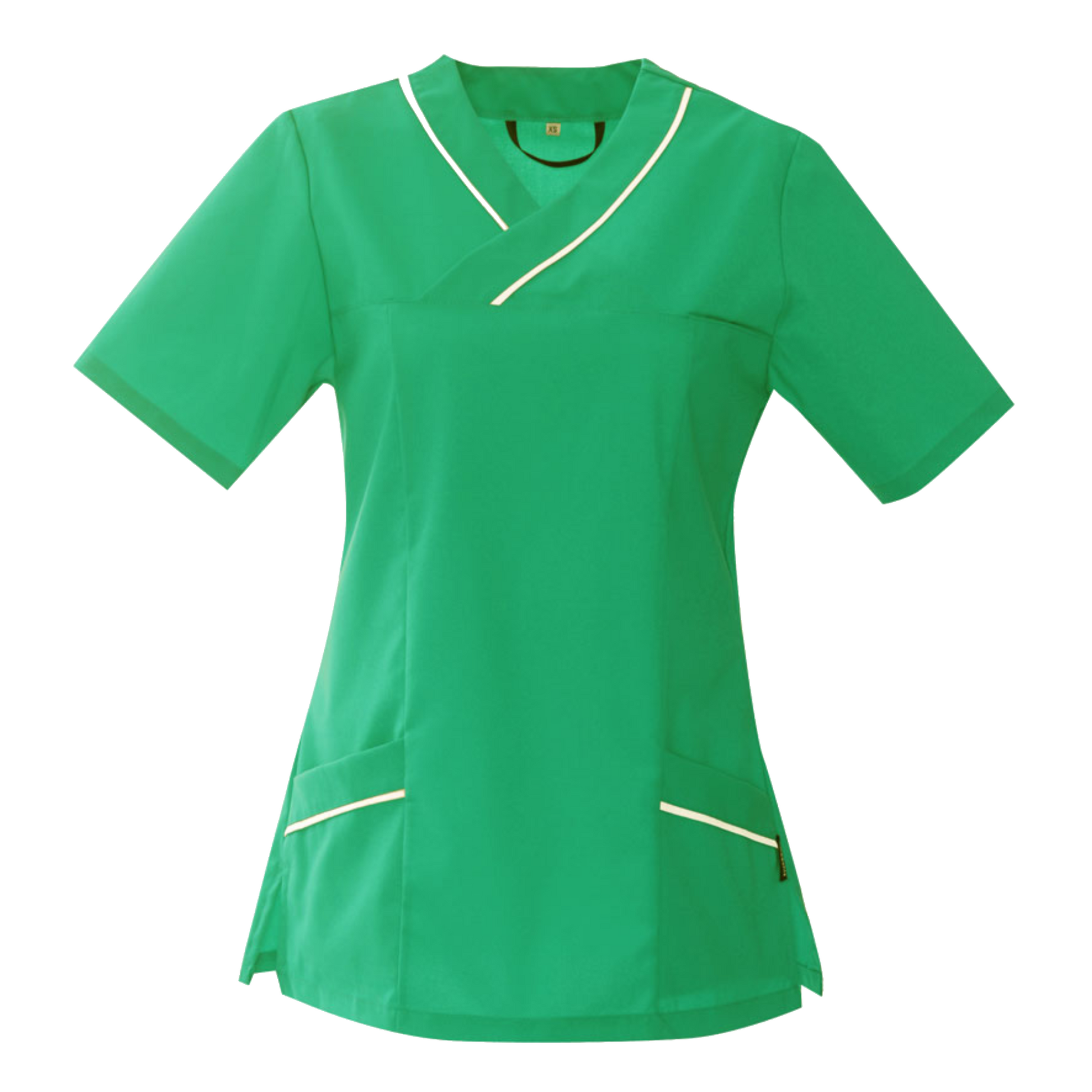 V-halsad bussarong i lätt insvängd modell med kort ärm och passpoal. Sprund i sidan och ryggveck för ökad rörelsevidd. Påsydd bröstficka och två utanpåfickor varav en med extra telefonficka och den andra med nyckelhälla.