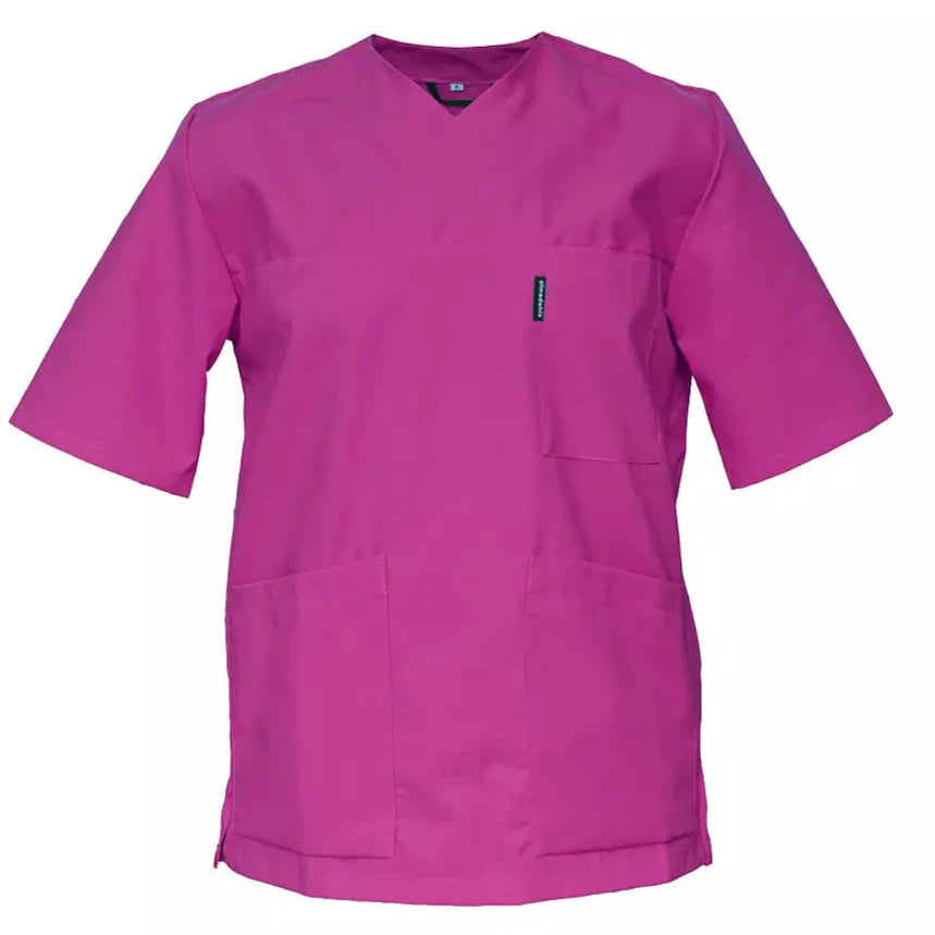 V-blus/bussarong i rak modell med kort ärm. Sprund i sidor och ryggveck för ökad rörelsefrihet. Påsydd bröstficka och två framfickor/sidfickor varav en med extra telefonficka och den andra med nyckelhälla. Hank i nacke.