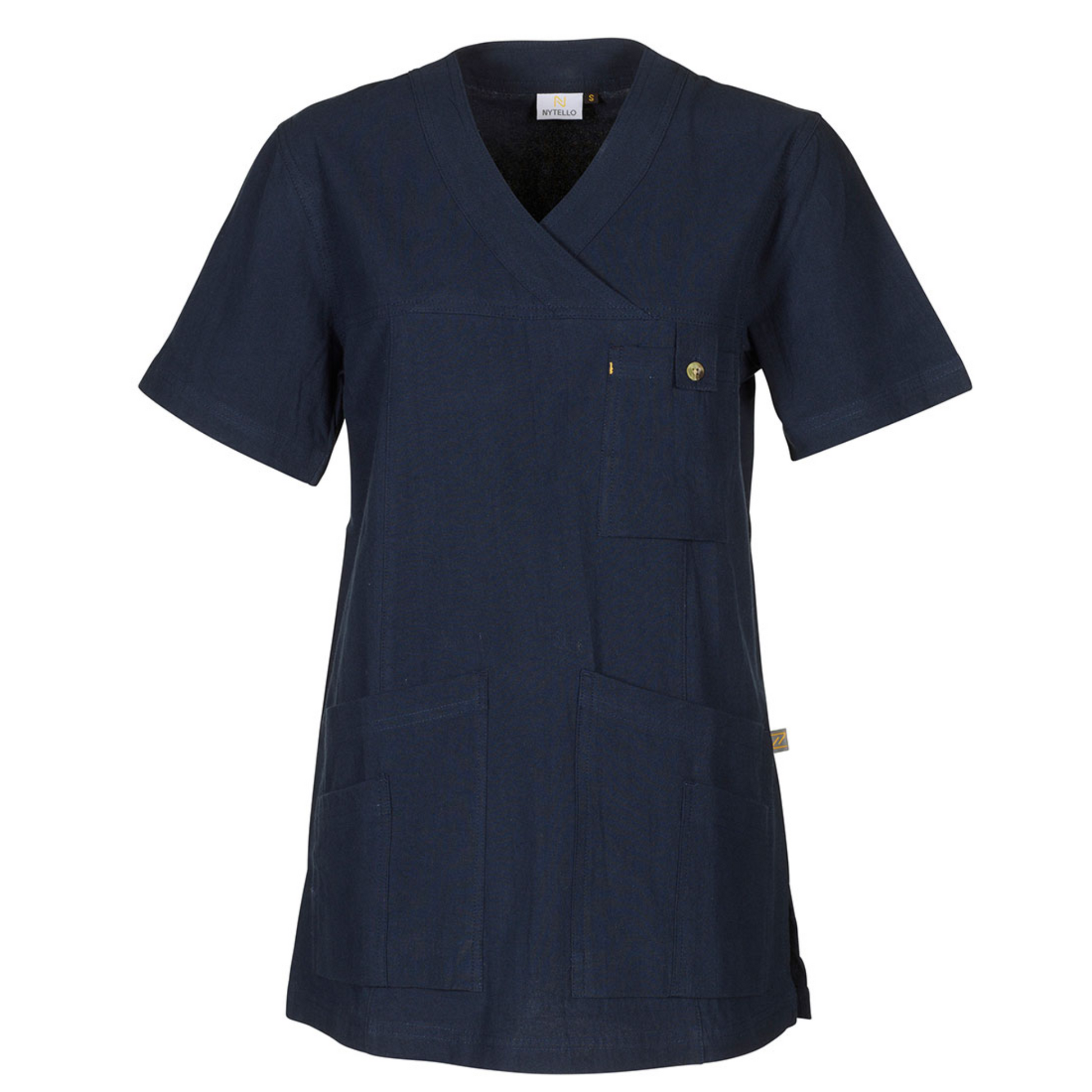 Bussarong i crinklad bomull med V-ringning och kort ärm. Sidfickor med bälg, telefonficka och extraficka. Bröstficka med bälg, knapp och tamp. Slits i sidor. Nyckelhälla i höger ficka. Något figursydd.