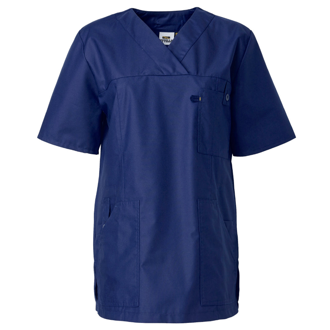 Lätt insvängd bussarong med V-ringning och kort ärm. Sidfickor med telefonficka och extraficka. Nyckelhälla i höger sidficka. Bröstficka med knapp och tamp samt nedstickning för penna. Korthållare. Slits i sidor. Hank i nacke.