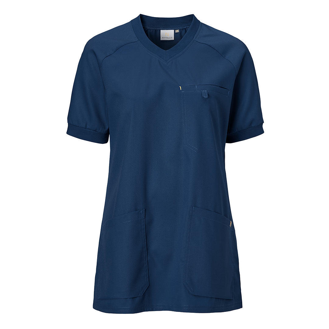 Stilren bussarong med V-ringning och kort ärm i skönt stretchmaterial. Bröstficka med pennficka. Två sidfickor, nyckelhälla och mobilficka i den högra. Slits i sidor. Något figursydd och knapphålsresår i ryggen för att kunna justera midjevidden. Längd mitt bak i storlek M: 74 cm