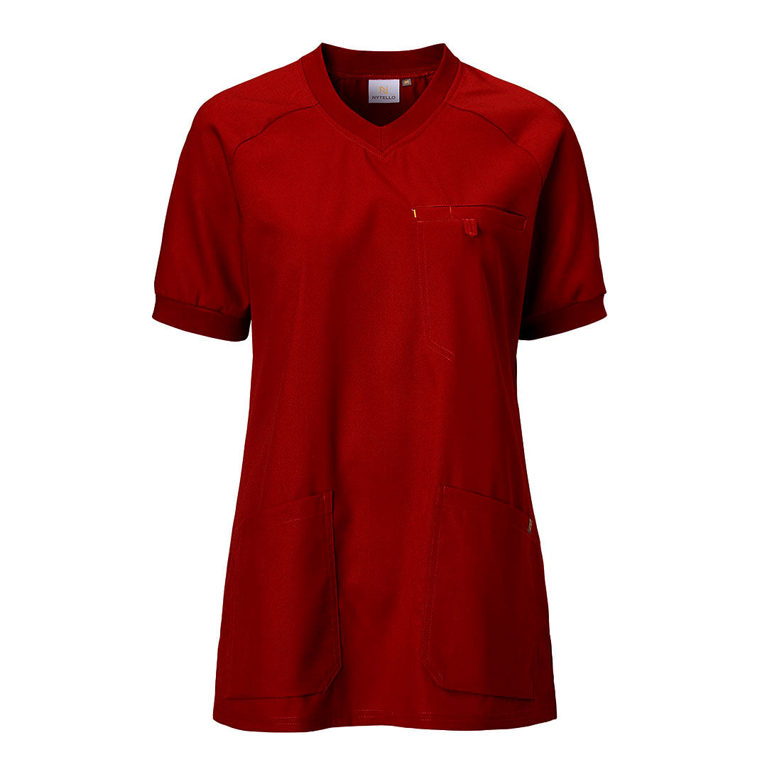 Stilren bussarong med V-ringning och kort ärm i skönt stretchmaterial. Bröstficka med pennficka. Två sidfickor, nyckelhälla och mobilficka i den högra. Slits i sidor. Något figursydd och knapphålsresår i ryggen för att kunna justera midjevidden. Längd mitt bak i storlek M: 74 cm