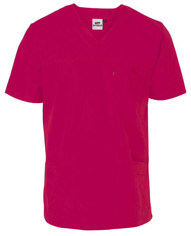 Rak bussarong med V-ringning och kort ärm. Sidfickor med telefonficka och extraficka. Bröstficka med knapp och tamp. Slits i sidor. Passar både dam och herr.