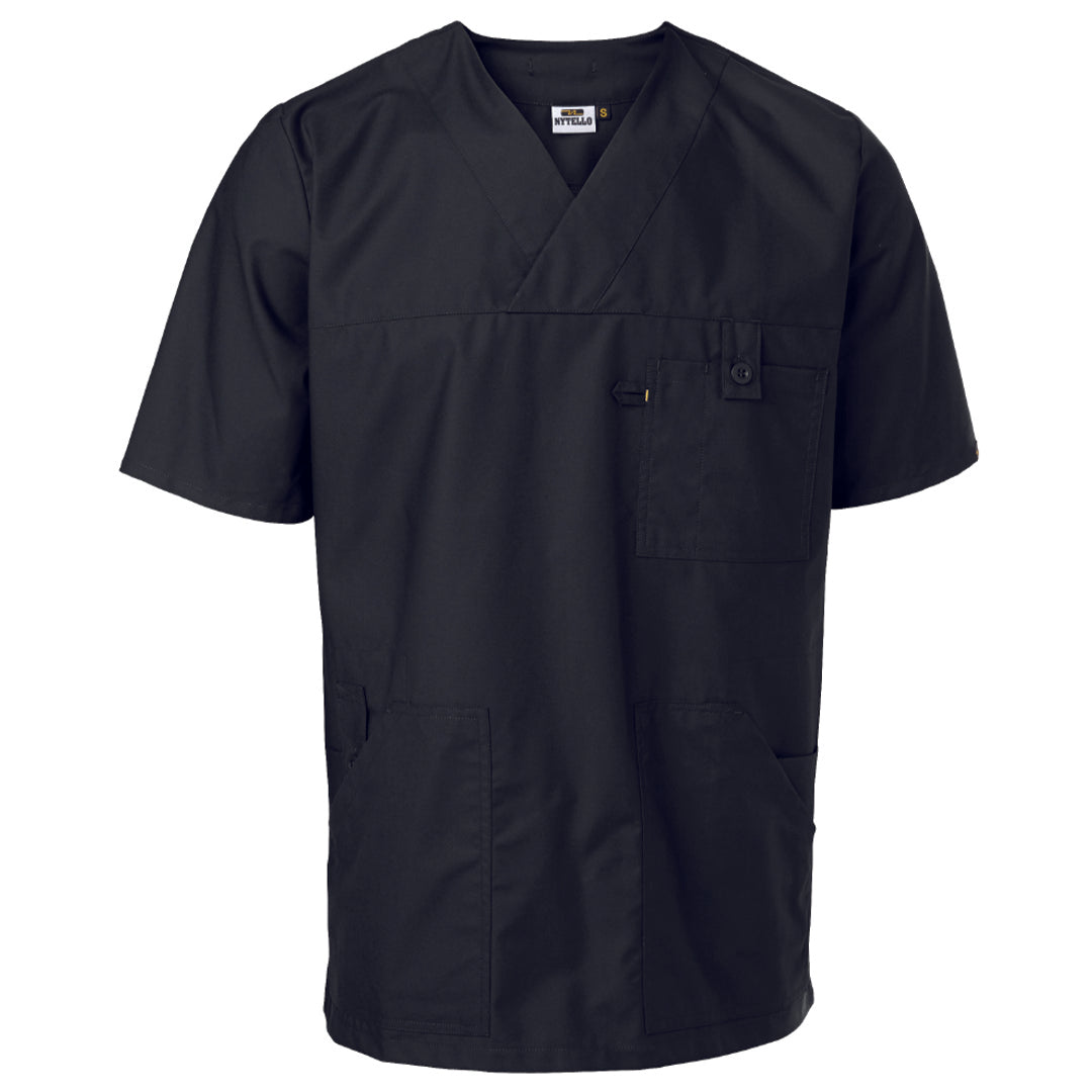 Rak bussarong med V-ringning och kort ärm. Sidfickor med telefonficka och extraficka. Nyckelhälla i höger sidficka. Bröstficka med knapp och tamp samt nedstickning för penna. Korthållare. Slits i sidor. Hank i nacke.