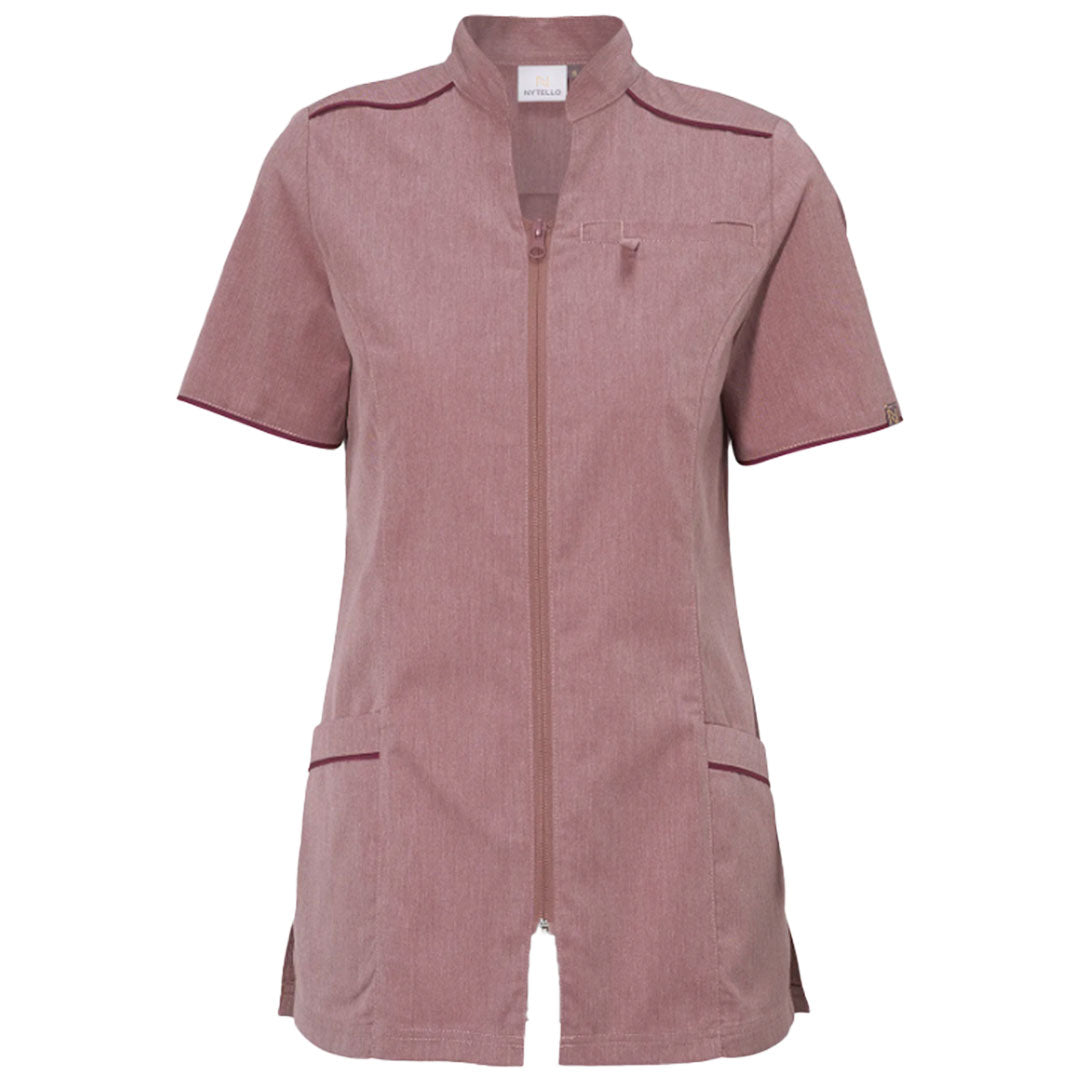 Damskjorta i lätt insvängd modell. Melangefärgat tyg med en enfärgad passpoal. Dragkedja framtill och ståkrage. Bröstficka med pennficka samt tamp. Två sidfickor, nyckelhälla och mobilficka i den högra. Slits i sidor. Längd i storlek M: 75 cm