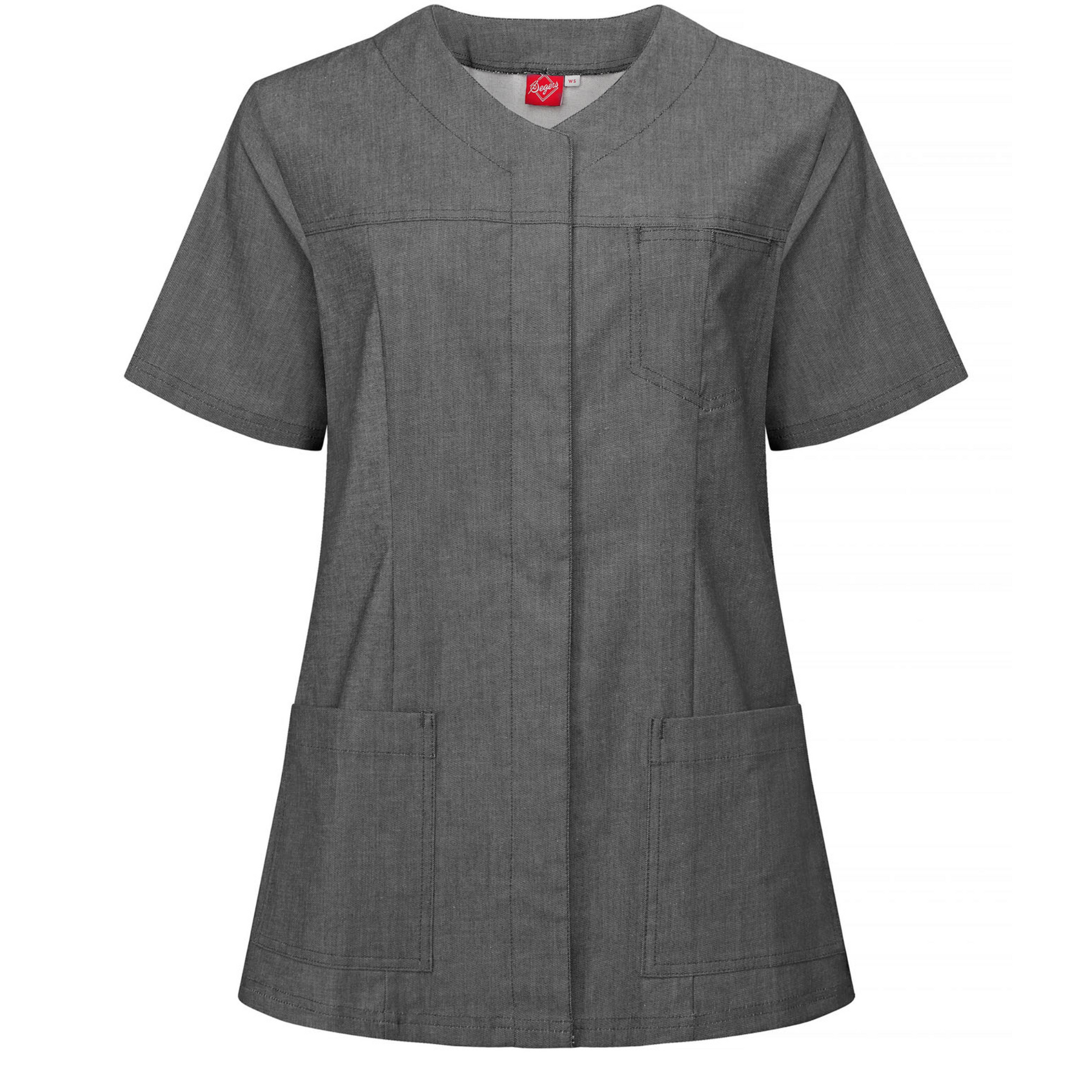 Vårdjacka i feminint snitt för den som vill ha ett slitstarkt plagg med stretch, som känns bra mot huden. Den har rikligt med fickor och dold knäppning framtill. Den melerade effekten i tyget bidrar till att t.ex. fläckar blir mindre synliga. Färgen behåller sin karaktär efter tvätt.